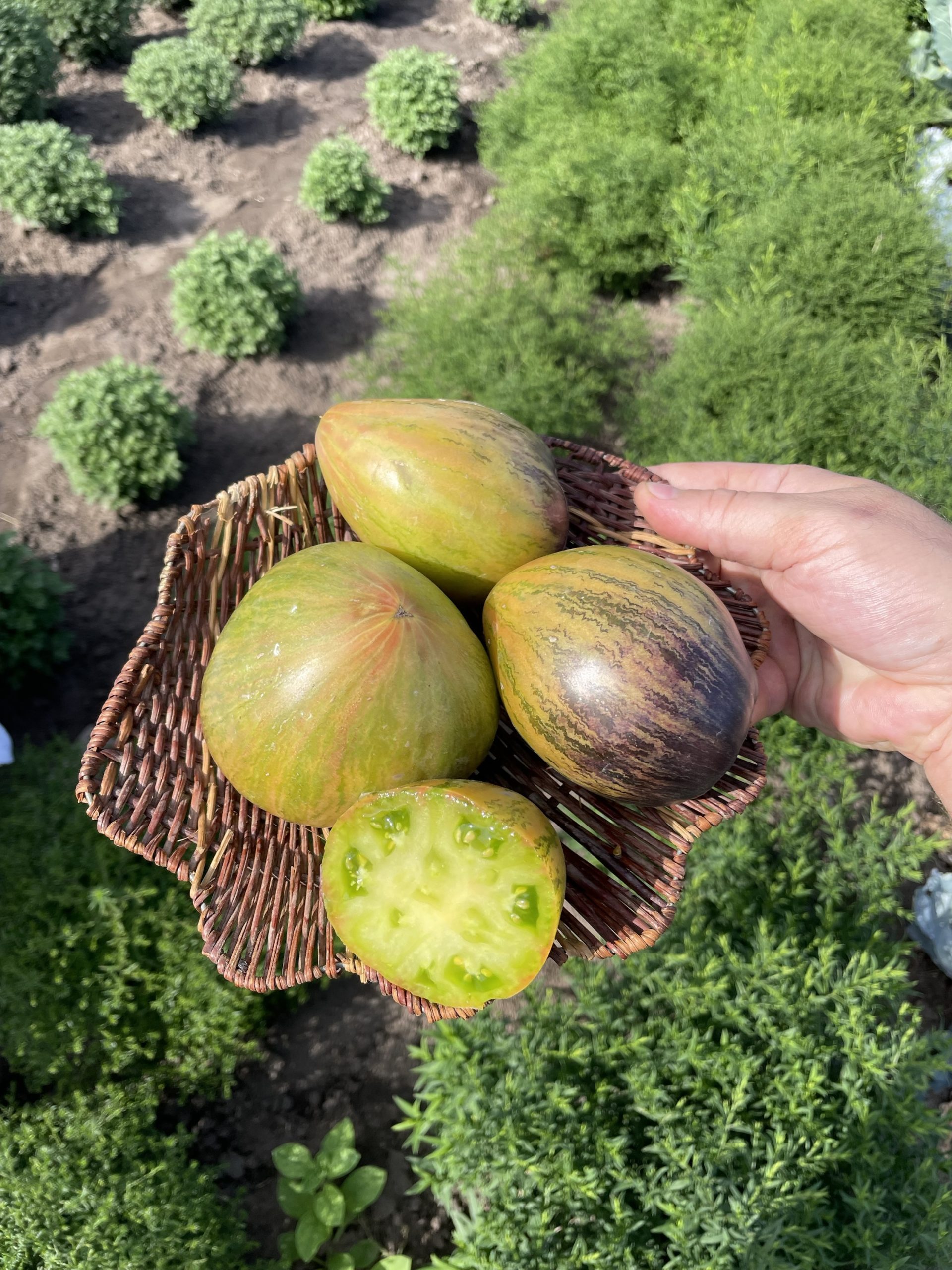 Томат Смарагдовая парча Софии — среднеспелый, высокорослый сорт с очень декоративными, крупными плодами салатного назначения.